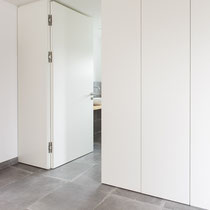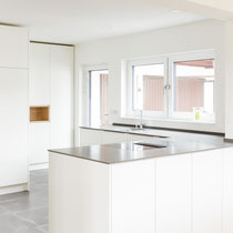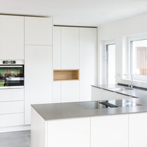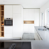 Schreinerküche mit frei stehendem Kochbereich und einer von den Hochschränken umfassten Speisekammer. Alle Fronten in Weißlack, offene Fächer in Eiche furniert, Arbeitsplatte Corian, Kochfeld flächenbündig und mit integrierter Dunstabzugshaube. Weiterhin ein Einbauelement im Eingangsbereich bestehend aus einer raumhohen Zimmertür zum Gäste-WC, sowie seitlichen Einbauschränken mit grifflosen Fronten. Oberfläche ebenfalls in Weißlack.